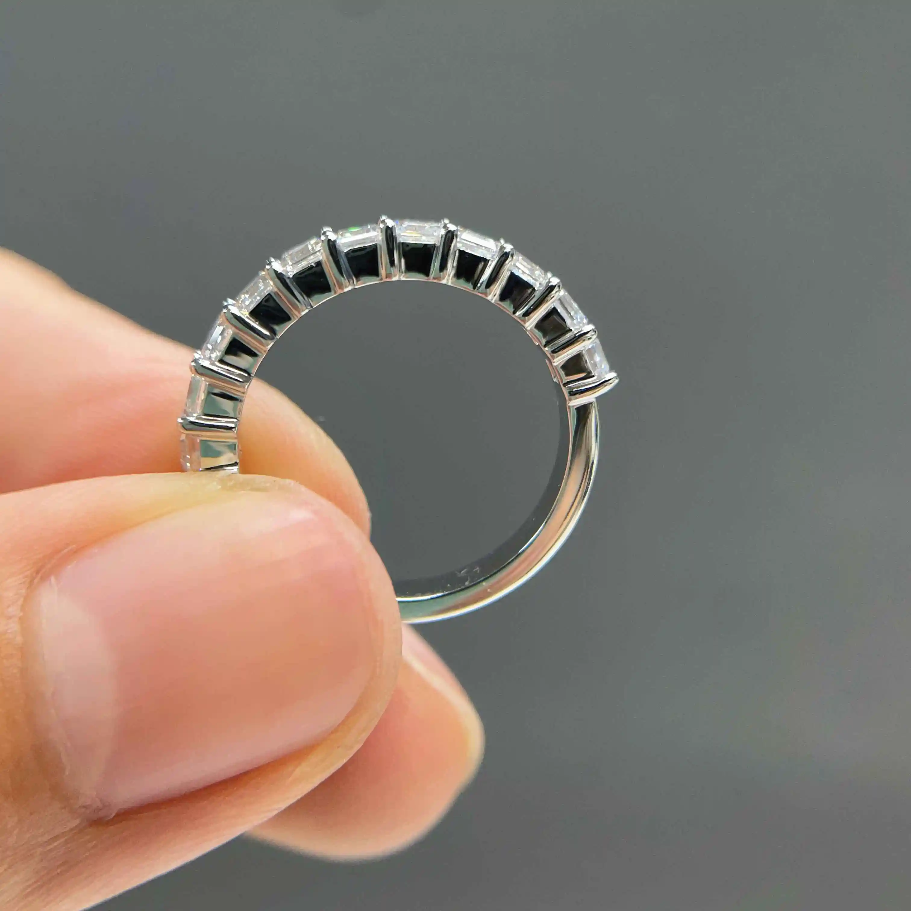 Defined by clean lines and subtle brilliance, this band features a half pavé design that enhances sparkle while maintaining an elegant, streamlined look. The step-cut diamonds create a refined sense of depth and symmetry, offering a sophisticated alternative to traditional styles. Perfect for stacking or wearing alone, it delivers timeless appeal with a modern architectural touch, ideal for both everyday wear and special occasions.