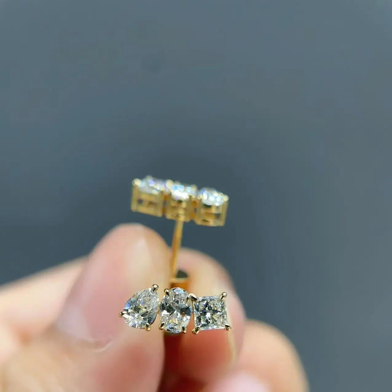 About this 18k yellow gold 3-stone ear studs with oval pear princess diamonds luxury fine jewelry accents with luxurious craftsmanship: