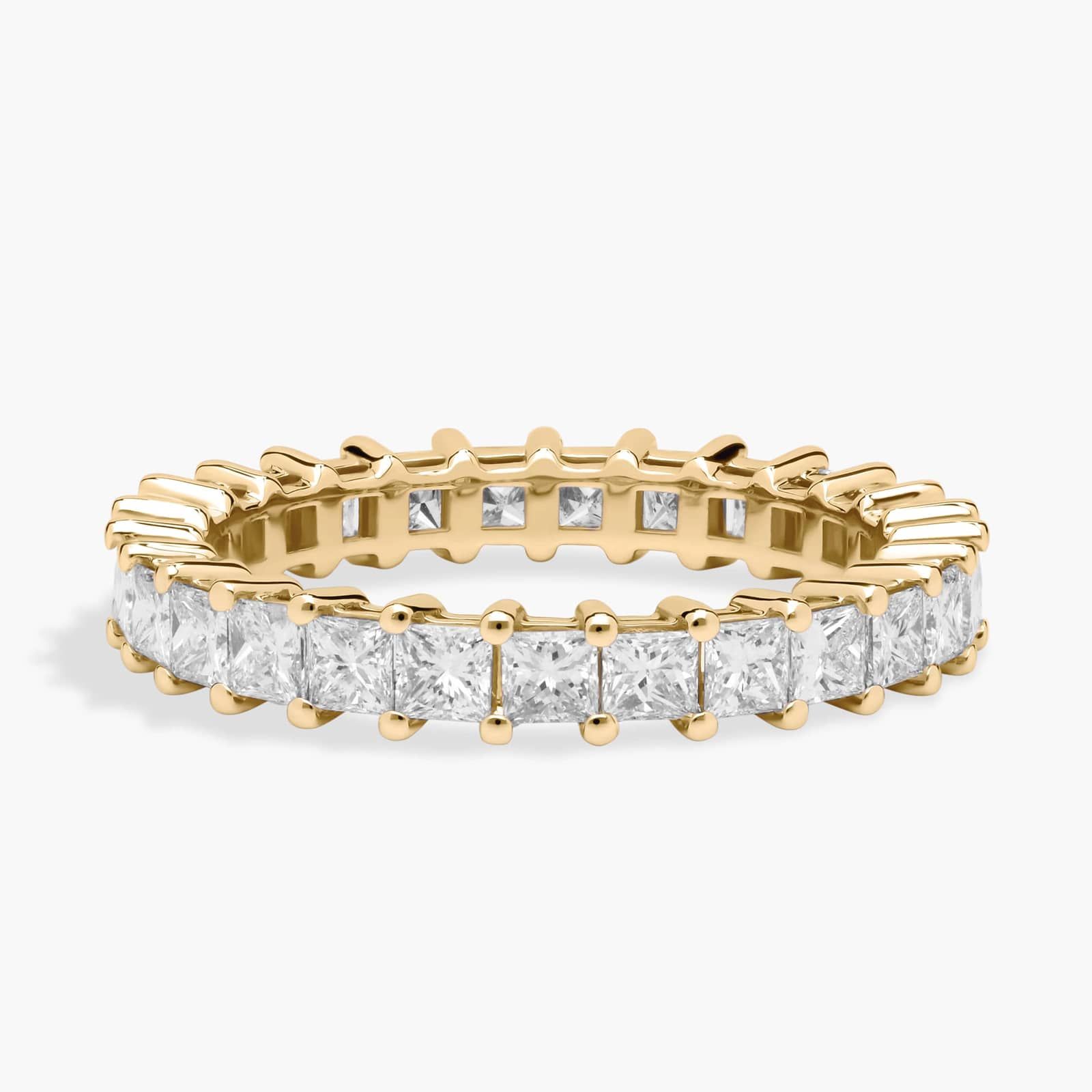 Crafted in 14K yellow gold, this custom eternity wedding band features 2 ct of princess-cut diamonds, expertly set to encircle the finger with continuous sparkle. The geometric brilliance of the princess cuts creates a modern yet timeless design, while the smooth band ensures comfortable everyday wear. Ideal as a wedding band, anniversary ring, or stacking piece, it combines refined craftsmanship with lasting elegance and sophisticated luxury.